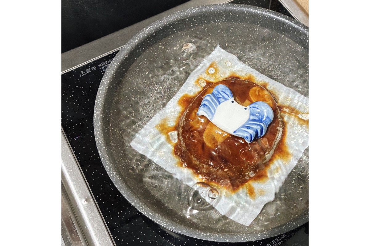 ひとり暮らしに戻るとき、母が冷凍ハンバーグを持たせてくれました。湯煎時間がなんと……22分。電子レンジ不可。ハンバーグがぷかぷか浮いてきたため、カニの箸置きで押さえています。いい重さでした。